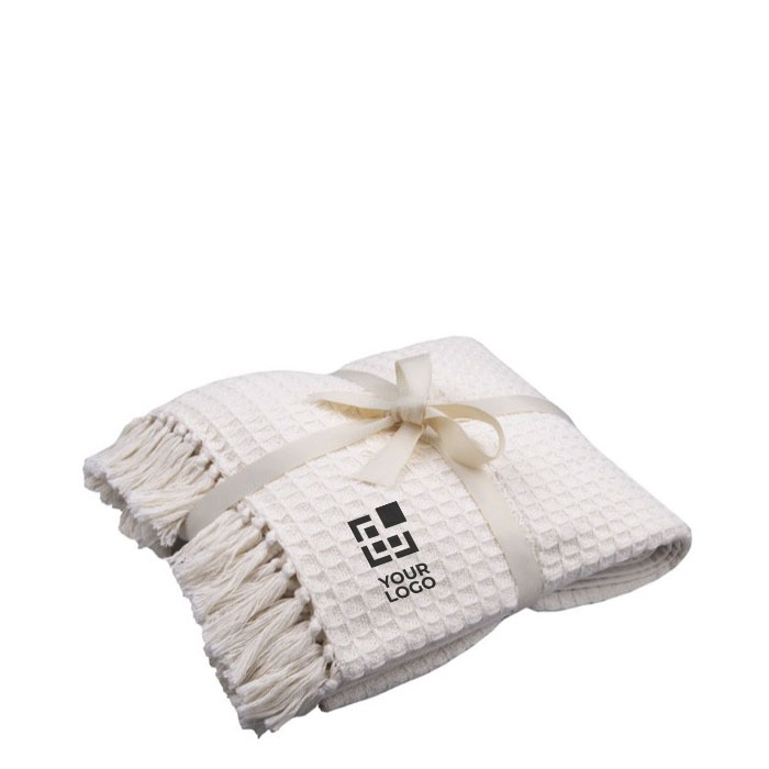 Manta de 130 x 160 cm fabricada en 100% algodón, ideal para ofrecer comodidad y calidez. Con un gramaje de 350 g/m², proporciona una sensación de lujo y durabilidad. Se presenta con una cinta del mismo material, añadiendo un toque de elegancia. En pedidos con impresión, se envían dobladas y a granel, aunque se puede optar por mantener la presentación original con un coste adicional. Perfecta para hoteles o centros de belleza, esta manta es una excelente opción para fidelizar a clientes recurrentes, ofreciendo una experiencia acogedora y memorable.