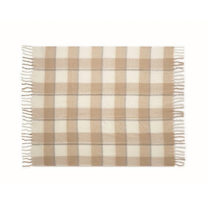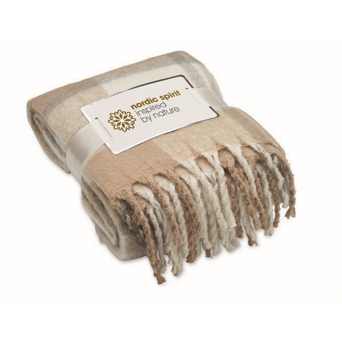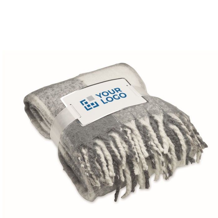 Manta de poliéster RPET mohair, diseñada con un elegante patrón a cuadros y flecos enrollados a mano. Este producto combina estilo y sostenibilidad, ya que está fabricado con materiales reciclados (RPET), lo que lo convierte en una opción ecológica para cualquier empresa. La manta viene envuelta en una cinta con una tarjeta imprimible, ideal para personalizar con el logo o mensaje de su empresa. Además, cuenta con un servicio Express para entregas rápidas. Perfecta para crear un ambiente acogedor en oficinas o como regalo corporativo en eventos y campañas de marketing.