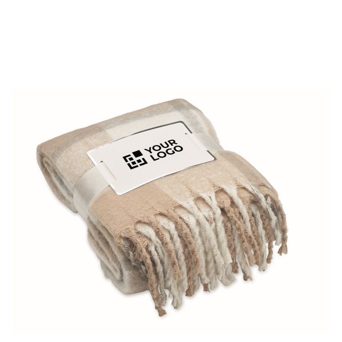 Manta de poliéster RPET mohair, diseñada con un elegante patrón a cuadros y flecos enrollados a mano. Este producto combina estilo y sostenibilidad, ya que está fabricado con materiales reciclados (RPET), lo que lo convierte en una opción ecológica para cualquier empresa. La manta viene envuelta en una cinta con una tarjeta imprimible, ideal para personalizar con el logo o mensaje de su empresa. Perfecta para crear un ambiente acogedor en oficinas o como regalo corporativo en eventos y campañas de marketing.