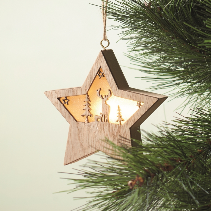 Estrella navideña de madera decorada con luz y cordón para colgar