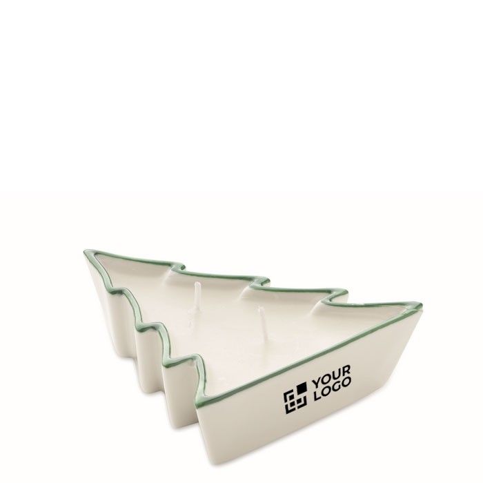 Vela de cera vegetal en un soporte de porcelana con forma de árbol de Navidad, equipada con dos mechas. Con un peso de 60 gramos, ofrece un tiempo de combustión de aproximadamente 4 horas, ideal para eventos o reuniones corporativas. El diseño elegante y festivo del soporte permite personalizarlo con el logo de la empresa, convirtiéndolo en un regalo corporativo sencillo y refinado para la temporada navideña. Además, el servicio Express asegura una entrega rápida, facilitando la planificación de campañas de marketing o eventos de fin de año.