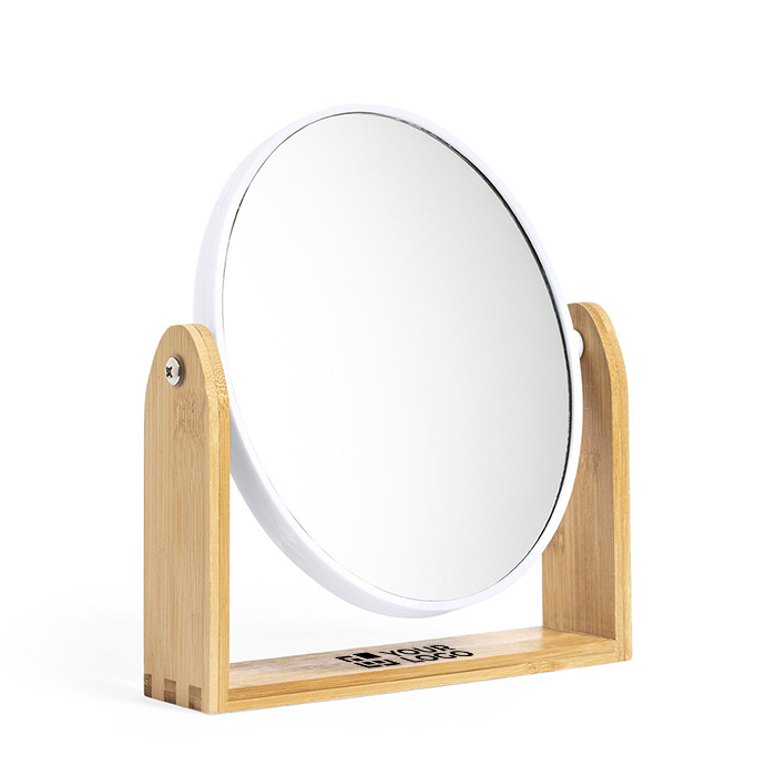 Espejo de sobremesa fabricado en bambú. Incluye dos espejos con aumentos de 1X y 3X, ideales para tareas que requieren precisión y detalle. Su diseño eco se presenta en una caja individual, lo que facilita su almacenamiento y transporte. El bambú no solo aporta un toque natural y elegante, sino que también es una opción sostenible y duradera. Perfecto para oficinas, salas de reuniones o como obsequio corporativo, este espejo puede personalizarse para reflejar la identidad de su empresa de manera sutil y efectiva.