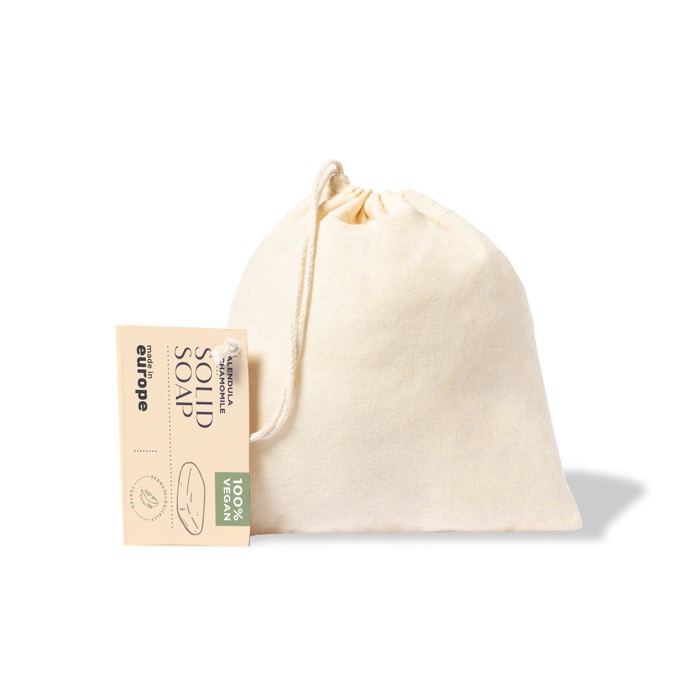 Pastilla de jabón vegano de 100 gr, fabricada en Europa, elaborada con ingredientes naturales como caléndula y manzanilla. Ofrece propiedades calmantes, hidratantes y reparadoras, ideales para el cuidado diario de la piel. Dermatológicamente testado, garantiza suavidad y seguridad en su uso. Se presenta en una bolsa individual de algodón, lo que facilita su almacenamiento y transporte, además de ser una opción sostenible. Perfecta para empresas que buscan productos de cuidado personal respetuosos con el medio ambiente, ideal para incluir en kits de bienvenida o como parte de estrategias de responsabilidad social corporativa.