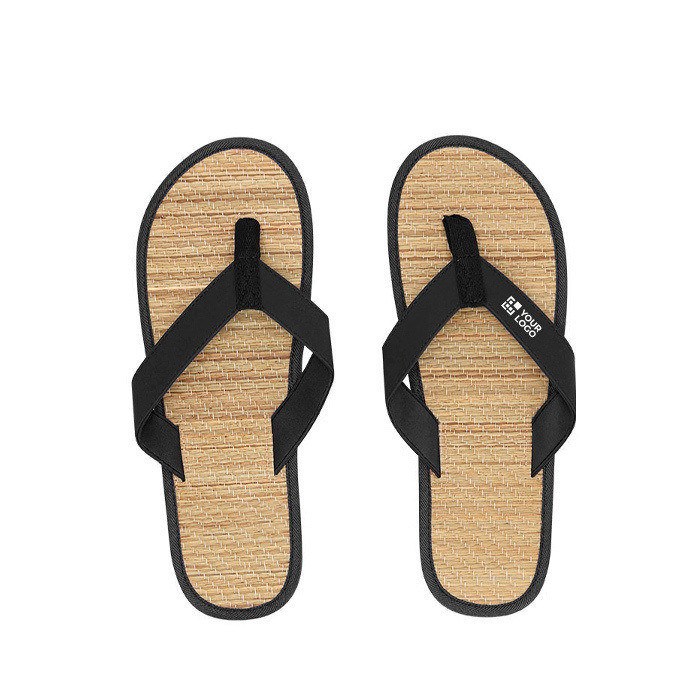 Chanclas con superficie de paja, tiras de piel sintética (PU) y suela de goma suave (EVA), pensadas para un uso cómodo en entornos de playa, piscina o vestuarios. La combinación de materiales aporta un apoyo agradable al pie y un ajuste sencillo para ponerse y quitarse rápido. La superficie de paja ofrece un acabado natural, mientras la suela de goma suave ayuda a amortiguar la pisada en superficies secas. Opción práctica para acciones de marca en eventos estivales, resorts o campañas de verano.