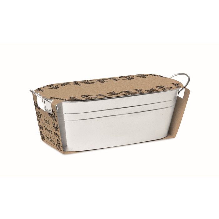 Maceta de zinc con una selección de tres hierbas, ideal para empresas que buscan un toque verde en sus espacios. Incluye semillas de albahaca, tomillo y perejil, junto con abono de jardín para facilitar el cultivo. Fabricado en la UE, garantiza calidad y sostenibilidad. El servicio Express asegura una entrega rápida, perfecta para cumplir con plazos ajustados. Personalizable, se adapta a las necesidades de branding de cualquier empresa. Útil para eventos corporativos o como regalo promocional en el sector de la jardinería, ofreciendo una experiencia práctica y ecológica.
