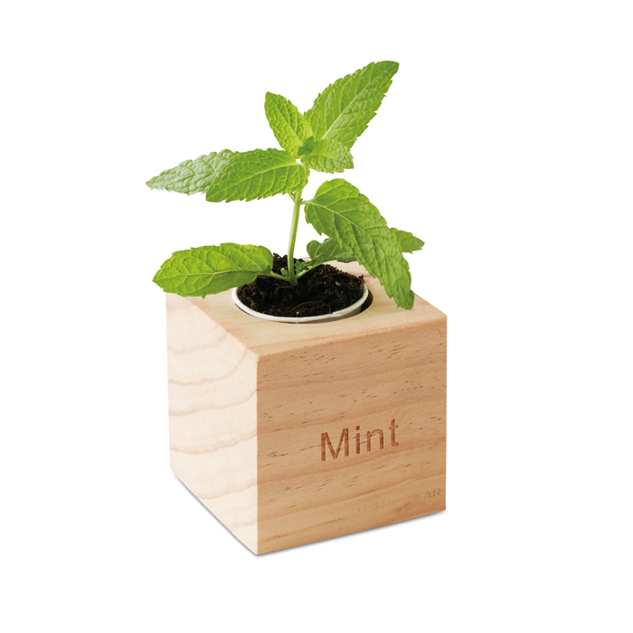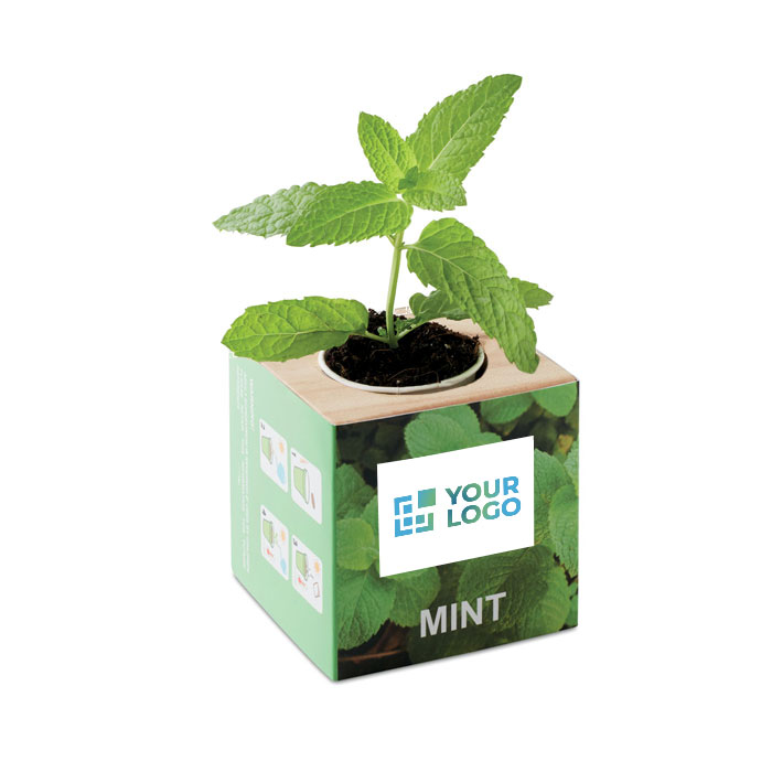 Maceta con semillas de menta en una elegante caja de madera. Incluye una tableta de tierra que facilita el proceso de plantación, permitiendo que las semillas germinen de manera eficiente. Ideal para oficinas, esta maceta es un regalo ecológico que puede personalizarse con el logo de tu empresa, asegurando que tu marca esté siempre presente en el escritorio de tus clientes. Además, el servicio Express garantiza una entrega rápida, perfecta para eventos corporativos o campañas de marketing que requieran soluciones inmediatas. Considera su uso en programas de fidelización o como obsequio en conferencias y ferias.
