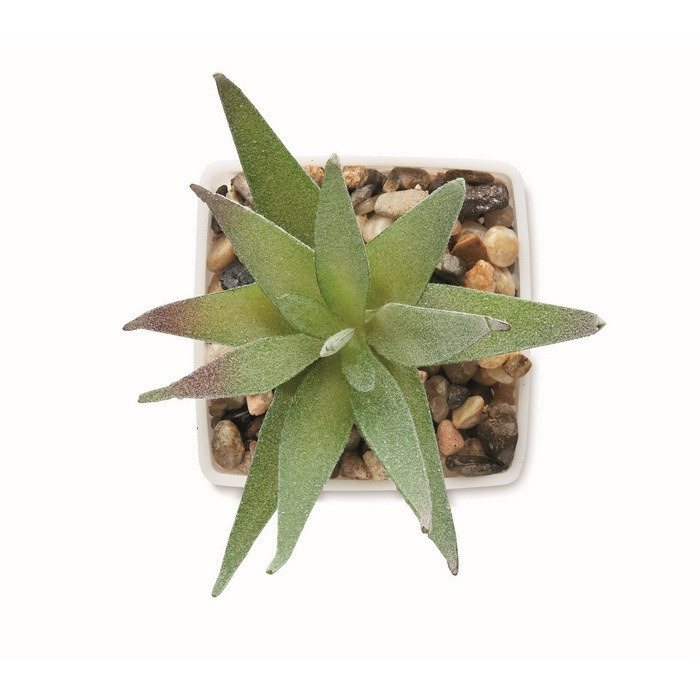 Mini planta artificial de PP con forma de aloe vera, pensada para colocar en escritorios, mostradores o salas de espera sin necesidad de riego ni cuidados. El material plástico aporta ligereza y facilita la limpieza, por lo que se puede mover y reubicar con facilidad. Su tamaño compacto ayuda a mantener una presencia discreta en espacios de trabajo o puntos de atención al cliente. Opción práctica para incluir en packs de bienvenida, kits para eventos o detalles corporativos en oficinas.