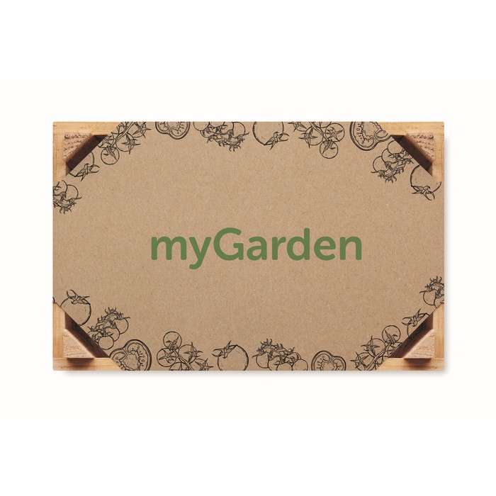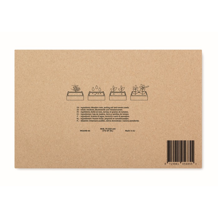Minihuerto de cultivo de tomates en caja de madera, con tierra apta para adobar. La variedad de tomates son los Raf (Solanum lycopersicum). La caja de madera es personalizable, siendo el grabado a láser la técnica más recomendada por el acabado que aporta y por lo difícil que es de dañar. Al ser un objeto pequeño, es adecuada para tener en cualquier hogar: ningún cliente o empleado se sentirá excluido si les haces este regalo, el cual es muy original. Fabricado en la UE. (Este producto contiene semillas y no se pueden vender ni enviar a Canarias por los controles fitosanitarios en la aduana a la entrada en Canarias.)