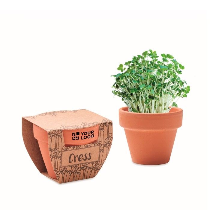 Pequeña maceta de terracota con semillas de berro, fabricada en la UE. Incluye una tableta de tierra que facilita el proceso de plantación. No disponible para la venta en el Reino Unido. Su diseño compacto la hace ideal para espacios interiores, terrazas y jardines, permitiendo a las empresas ofrecer un toque verde en sus oficinas o eventos. El servicio Express asegura una entrega rápida y eficiente. Perfecta para iniciativas de sostenibilidad corporativa o como obsequio en eventos empresariales.