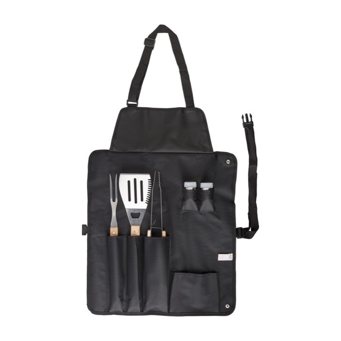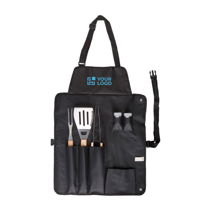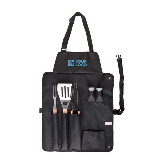 Set de 6 utensilios para barbacoa fabricados en acero inoxidable, diseñados para ofrecer durabilidad y resistencia. Incluye un delantal de nilón negro de 600 D, que no solo organiza los utensilios, sino que también es personalizable para adaptarse a la imagen de su empresa. El set cuenta con un tenedor, una espátula, pinzas, un salero y un pimentero, todos esenciales para una experiencia de barbacoa completa. Cada set se suministra en una bolsa y caja, facilitando su almacenamiento y transporte. Ideal para eventos corporativos o como regalo promocional, este set puede reforzar la presencia de su marca en actividades al aire libre.