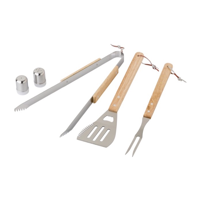 - Incluye tenedor, espátula, pinzas, salero y pimentero