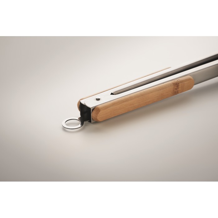 Pinzas de barbacoa de acero inoxidable con asas de bambú. Diseñadas para ofrecer durabilidad y resistencia, estas pinzas combinan la robustez del acero inoxidable con la calidez del bambú, un material natural que puede presentar variaciones de color. El mecanismo de bloqueo asegura un manejo seguro y eficiente, permitiendo un almacenamiento compacto. Ideales para empresas que buscan utensilios de cocina de calidad, estas pinzas son perfectas para eventos corporativos o como parte de un kit de regalo para clientes. El servicio Express garantiza una entrega rápida y eficiente.