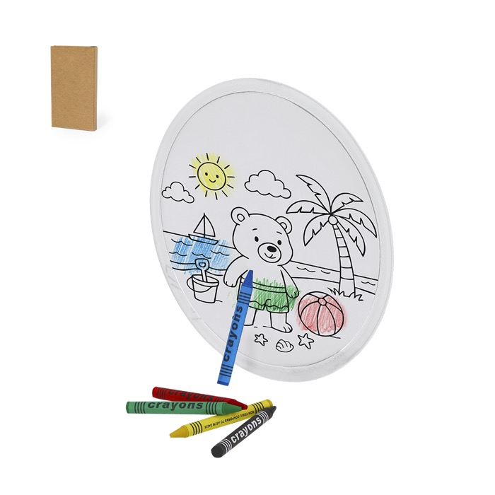 Frisbee infantil de tejido non-woven con zona para colorear. Incluye un conjunto de 5 ceras para pintar directamente sobre el área de dibujo, con un motivo de osito en la playa que ayuda a entretener durante más tiempo. Formato ligero y fácil de transportar, pensado para acciones donde se busca combinar juego activo y actividad creativa en un solo artículo. Recomendado para campañas de colegios, eventos familiares, animación en puntos de venta o regalos corporativos orientados a público infantil.