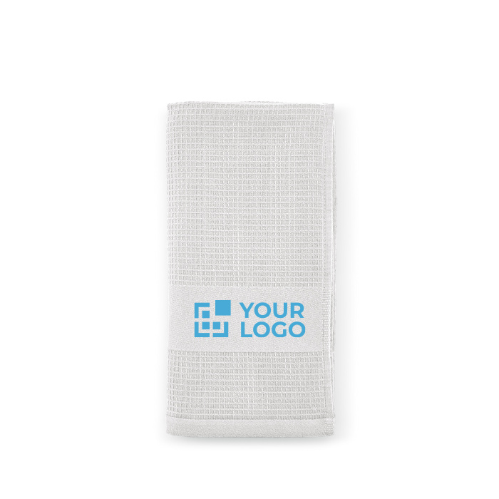 La toalla facial de algodón waffle reciclado, fabricada en Portugal, combina sostenibilidad y confort. Con un 60% de algodón reciclado y 40% de algodón, ofrece una textura suave y absorbente gracias a su gramaje de 500 g/m². Sus dimensiones de 50x100 cm son ideales para un uso versátil. La elegante banda estampada añade un toque de estilo, mientras que el colgador de algodón facilita su almacenamiento. Se presenta en una bolsa individual biodegradable, subrayando su compromiso con el medio ambiente. Perfecta para empresas que buscan productos sostenibles, puede ser utilizada en hoteles, spas o como parte de un kit de bienvenida corporativo.