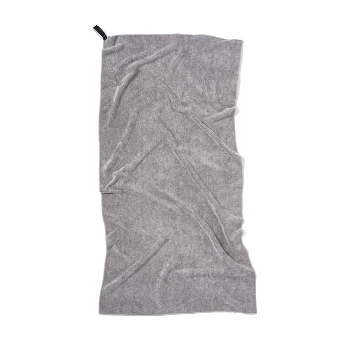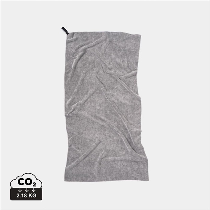 Toalla deportiva de microfibra de la marca Vinga, fabricada a partir de botellas PET recicladas. Su tacto único permite una absorción superior de agua y un secado tres veces más rápido que las toallas tradicionales. Ideal para actividades al aire libre y deportes, esta toalla es ligera y compacta, lo que la hace perfecta para viajar o llevar al gimnasio. Con un 52% de materiales reciclados certificados por GRS (Global Recycle Standard), asegura una cadena de suministro completamente certificada. Suministrada en bolsa y a granel, es una opción práctica para empresas que buscan productos sostenibles para eventos corporativos o promociones.