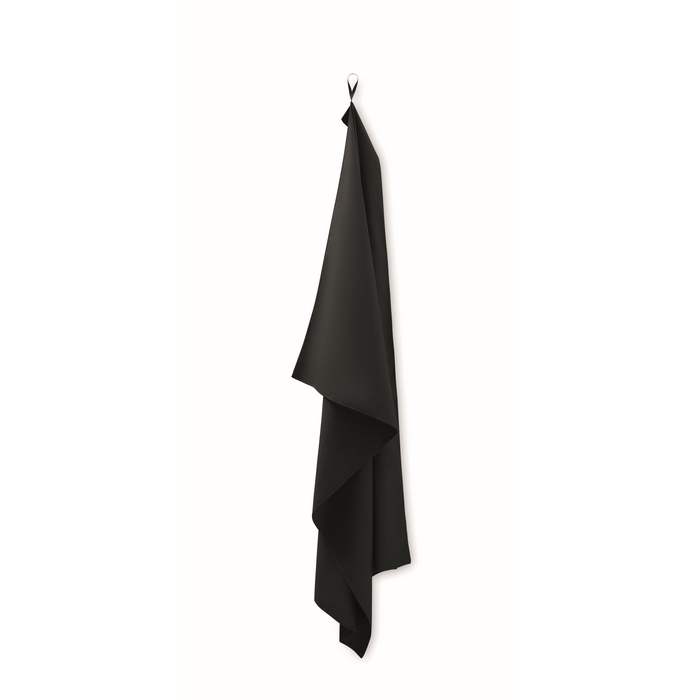 Toalla ligera de microfibra con secado rápido y lazo elástico para colgar. Optimiza tu merchandising deportivo con un producto práctico y fácil de transportar.