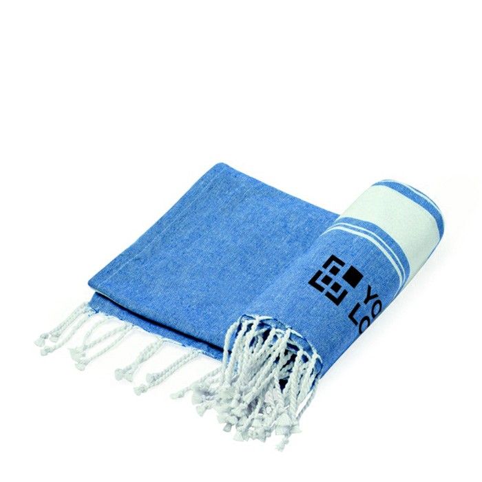 El pareo toalla de algodón y poliéster, disponible en una gama bicolor, es un regalo promocional ideal para eventos de verano o campañas de bienestar corporativo.