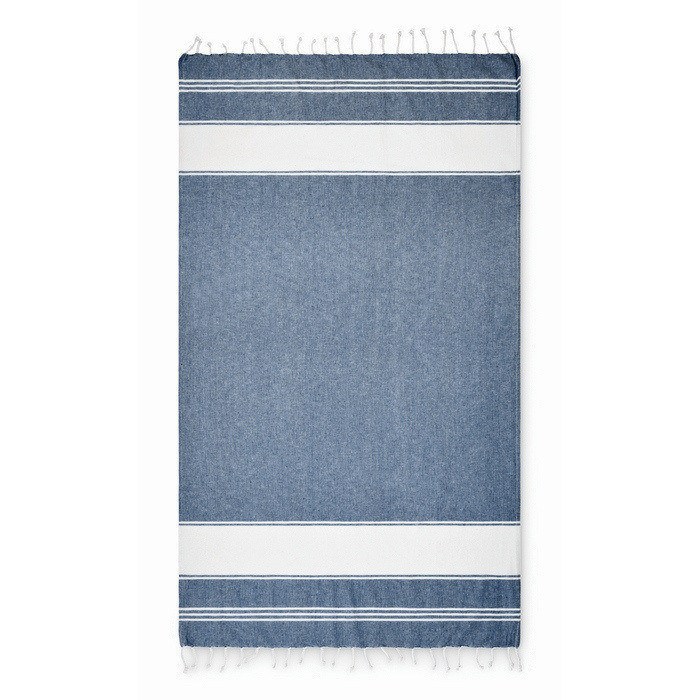 Set de toalla de playa tipo hammam con bolsa de playa, fabricado en mezcla de 70% algodón y 30% poliéster con gramaje de 180 g/m². La toalla ofrece un formato práctico para llevar en viajes, eventos al aire libre o jornadas de verano, y la bolsa ayuda a transportarla y guardarla con orden. Material ligero y fácil de manejar, pensado para un uso frecuente. Opción útil para kits corporativos de verano, acciones en playa o regalos para empleados.