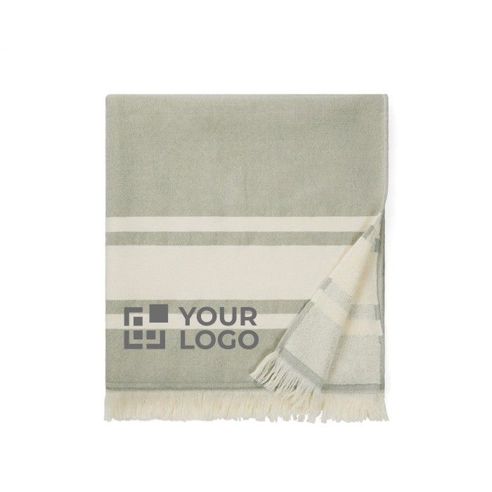 Toalla hammam de Vinga, confeccionada en 75% algodón y 25% poliéster, ofrece una combinación única de texturas con una cara de rizo y otra de tejido tafetán. Este diseño versátil proporciona una excelente absorbencia y un secado rápido, ideal para su uso en la playa, junto a la piscina o en actividades al aire libre. Con un grosor de 360 g/m² y dimensiones de 180x80 cm, excluyendo los flecos de 5 cm, garantiza comodidad y funcionalidad. Certificada por OEKO-TEX® ESTÁNDAR 100, asegura calidad y seguridad. Perfecta para empresas que buscan productos prácticos para eventos corporativos o promociones.