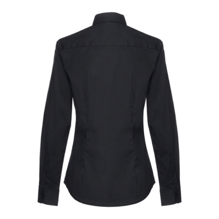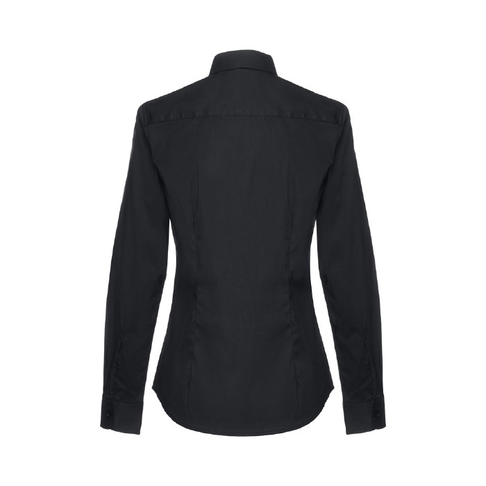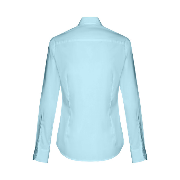 Camisa de popelina de manga larga para mujer, confeccionada en 68% algodón, 28% poliamida y 4% elastano, con un gramaje de 115 g/m². Presenta un corte ajustado gracias a dos pinzas en la espalda, lo que garantiza un ajuste ceñido y elegante. La tapeta cuenta con 7 botones a color, mientras que las mangas largas incluyen un pliegue y puños ajustables con un botón. Se recomienda planchar a un máximo de 110º y lavar en lavadora a 30º, evitando secadora y lejía. Ideal para personalización y uso como camisas serigrafiadas, perfecta para uniformes corporativos o eventos de marketing.