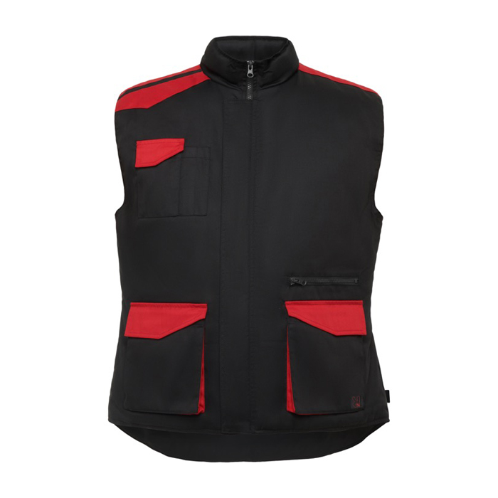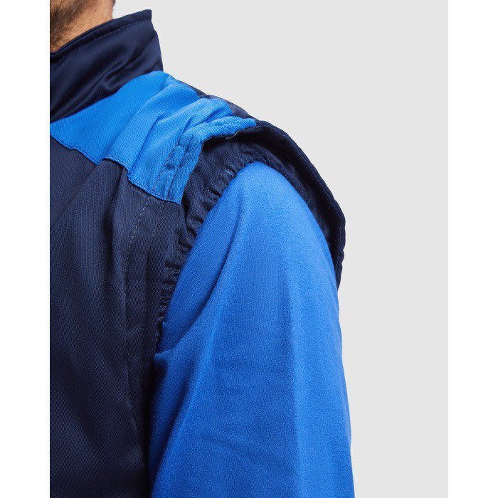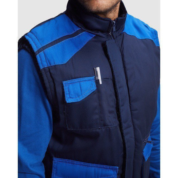 Chaleco laboral multibolsillos para hombre de la marca Roly, confeccionado en material resistente con un gramaje de 200.0. Diseñado en colores combinados, cuenta con un cuello alto que proporciona protección adicional. La cremallera central y el cierre de velcro aseguran un ajuste cómodo y seguro. Incluye piezas en los hombros y detalles a contraste que añaden un toque moderno. Las bocamangas cortavientos ofrecen protección contra el viento. Dispone de un bolsillo exterior para móvil con tapeta y velcro, dos bolsillos frontales con fuelle, tapeta y velcro, dos depósitos para bolígrafos, un bolsillo interior con velcro, y un bolsillo con cremallera. El ajustador con cierre automático y el bajo posterior con faldón completan su funcionalidad. Ideal para empresas que buscan uniformes prácticos y versátiles para sus empleados en entornos dinámicos.