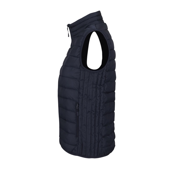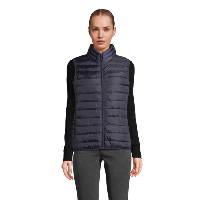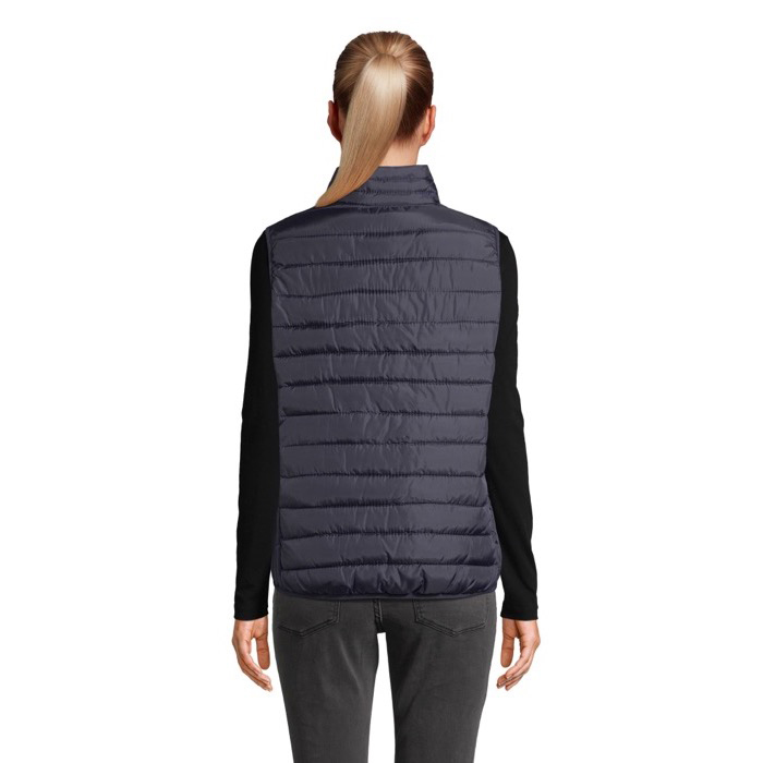 Chaleco ligero para mujer de la marca SOL'S, confeccionado con un tejido exterior y forro de 100% poliéster, y un acolchado de plumón también de poliéster. Este chaleco cuenta con un cierre frontal y bolsillos laterales con cremalleras de nailon a tono, asegurando un diseño uniforme y elegante. Los deslizadores de metal tono sobre tono y los tiradores de cremallera negros de fantasía añaden un toque distintivo. El cuello alto y el bies elástico a tono en las sisas y el dobladillo garantizan un ajuste cómodo. Con un gramaje de 280.0, es ideal para actividades al aire libre. Se entrega con una práctica bolsa de almacenamiento. Perfecto para personalización corporativa o como uniforme para eventos al aire libre.