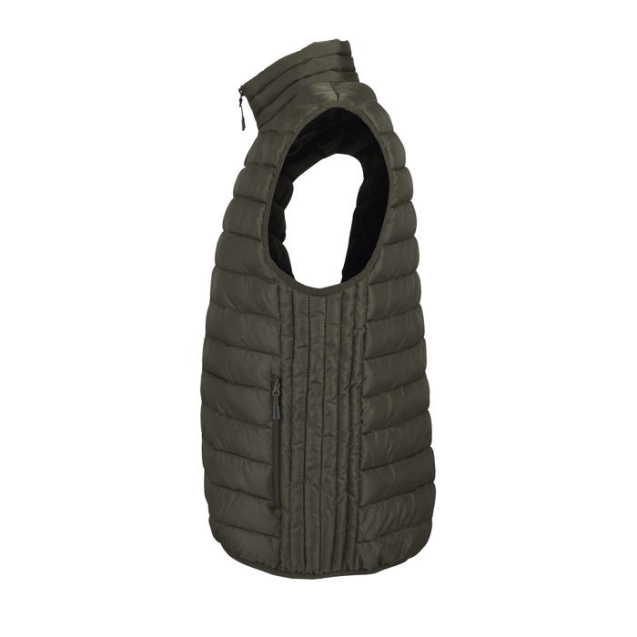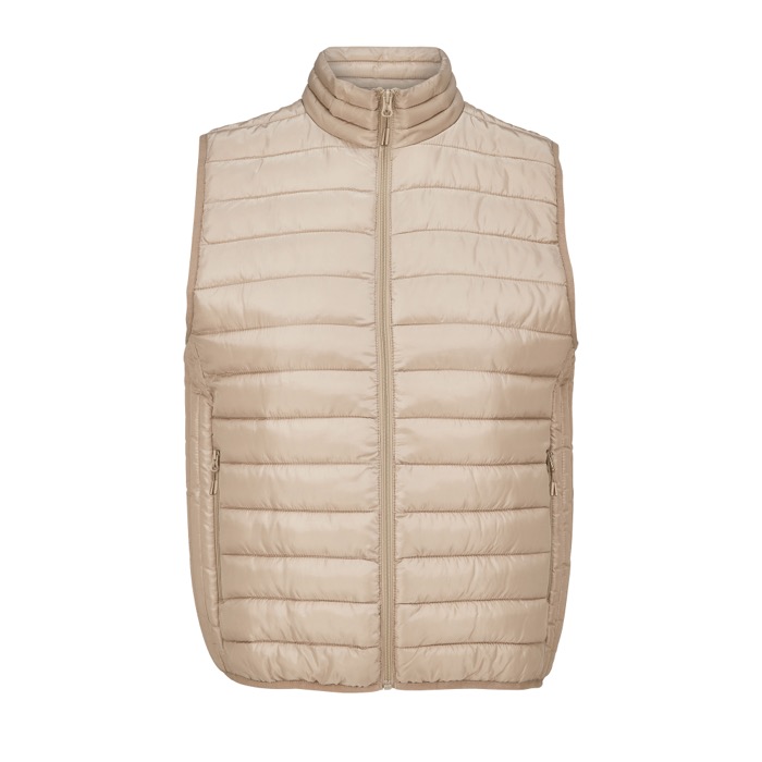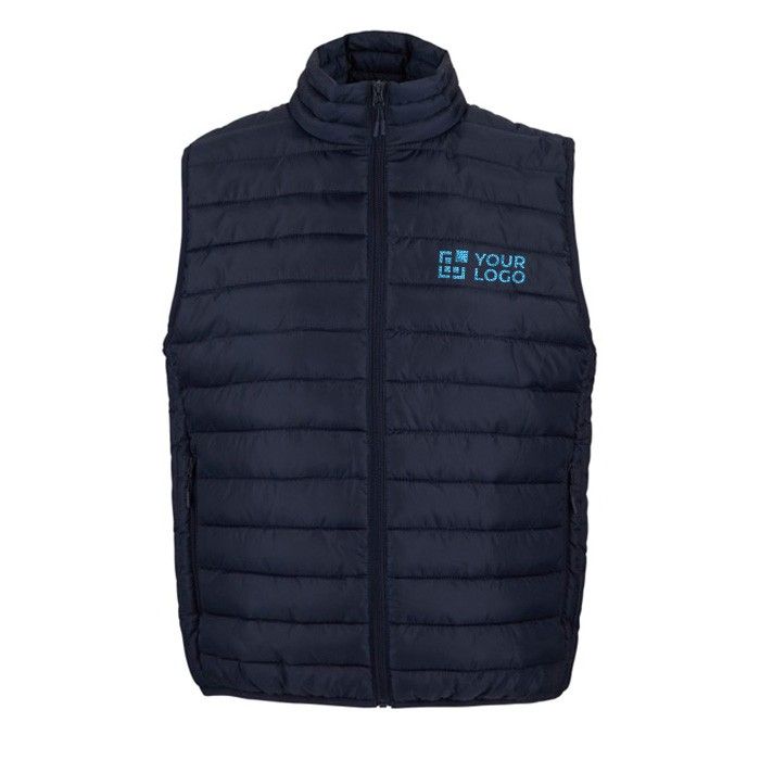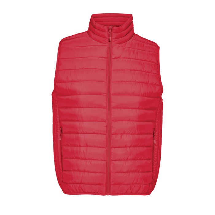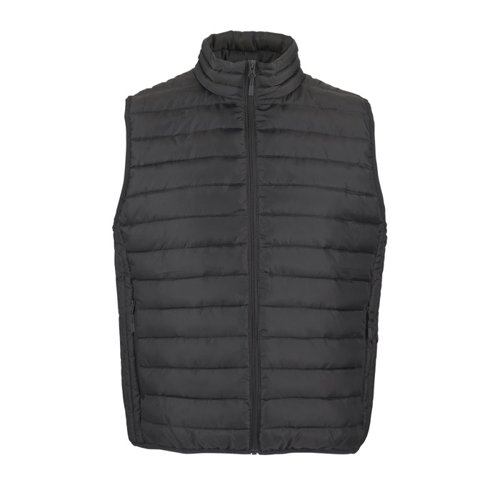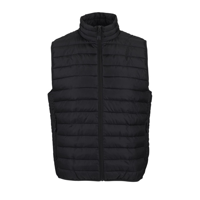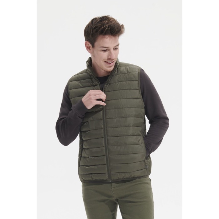 Chaleco ligero para hombre fabricado por SOL'S, con un tejido exterior y forro de 100% poliéster, y un acolchado de plumón también de poliéster. Este chaleco presenta un cierre frontal y bolsillos laterales con cremalleras de nailon a tono, complementados con deslizadores metálicos y tiradores de cremallera negros de fantasía. El diseño incluye un cuello alto y ribetes elásticos a tono en las sisas y el dobladillo, ofreciendo un ajuste cómodo y seguro. Con un gramaje de 280.0, es ideal para mantener la calidez sin sacrificar la ligereza. Se suministra con una práctica bolsa de almacenamiento, facilitando su transporte y almacenamiento. Perfecto para uniformes corporativos o eventos de marketing, donde la elegancia y funcionalidad son clave. Además, cuenta con servicio Express para entregas rápidas.