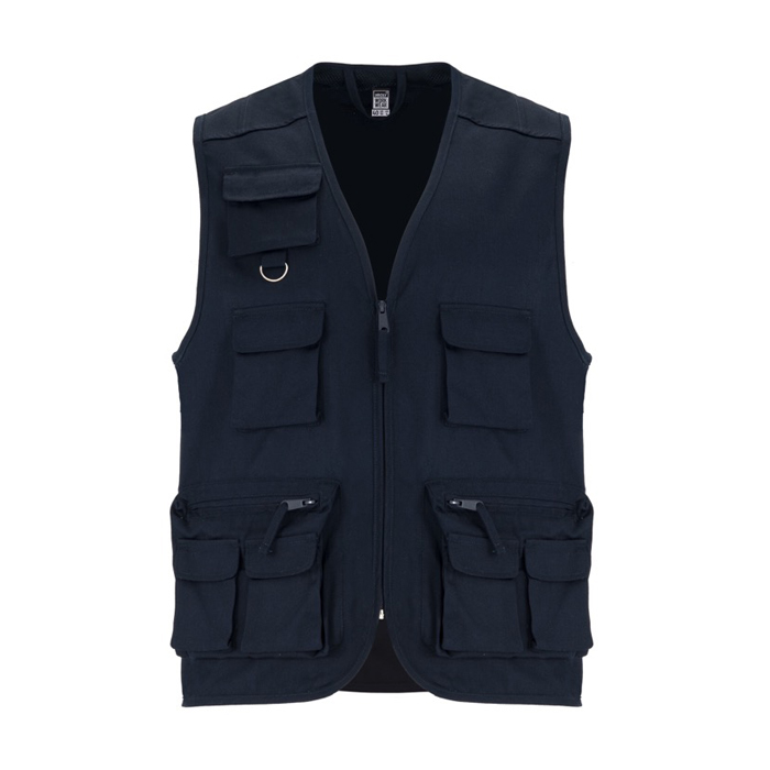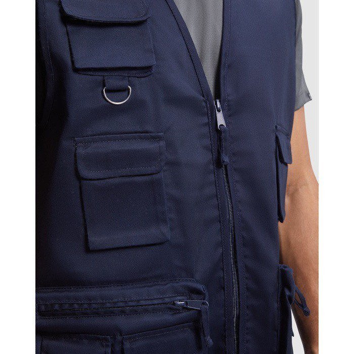 Chaleco laboral multibolsillos de la marca Roly, confeccionado en material resistente y diseñado para hombres. Presenta un cuello en pico y una cremallera central con tirador, complementado con ribetes en el cuello, sisas y bajos para un acabado limpio. Ofrece múltiples opciones de almacenamiento: tres bolsillos en el pecho con solapa y cierre de velcro, un bolsillo superior con anilla multifunción, dos bolsillos laterales con cremallera y tirador, dos bolsillos superpuestos con solapa y cierre de velcro, y dos bolsillos traseros con tapeta y cierre de velcro. Con un gramaje de 200.0, es ideal para entornos laborales que requieren organización y acceso rápido a herramientas o dispositivos. Perfecto para empresas que buscan equipar a su personal con prendas funcionales y prácticas.