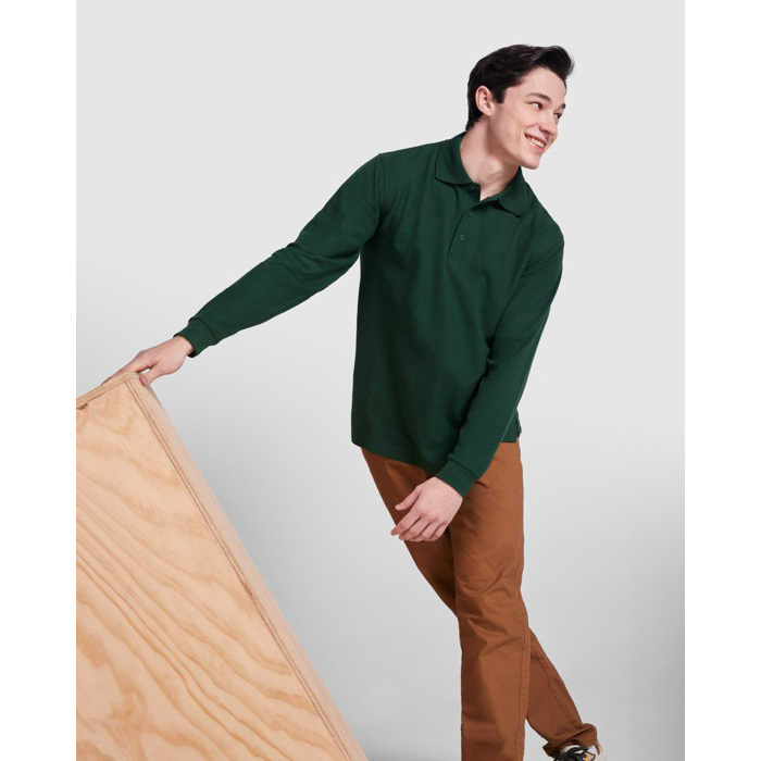 Polo de manga larga para hombre, fabricado por Roly, con un gramaje de 220.0. El diseño incluye un cuello acanalado y bocamangas que aportan un toque clásico y profesional. Los puños canalé 1x1 con elastano aseguran un ajuste cómodo y flexible. El cubrecosturas reforzado en el cuello añade durabilidad, mientras que la tapeta de 3 botones permite un ajuste personalizado. Las aperturas laterales están diseñadas para ofrecer mayor movilidad, ideal para un entorno laboral dinámico. Este polo es una excelente opción para uniformes corporativos, proporcionando una apariencia pulida y profesional sin sacrificar la comodidad.