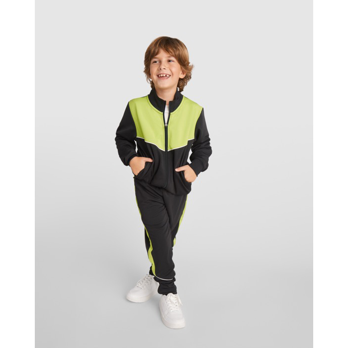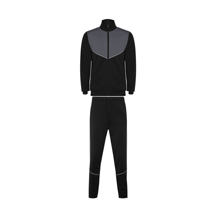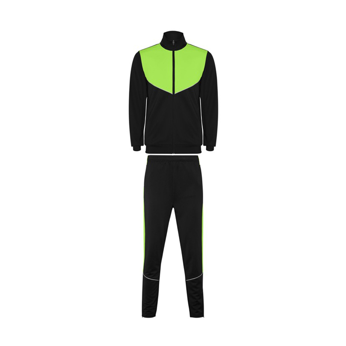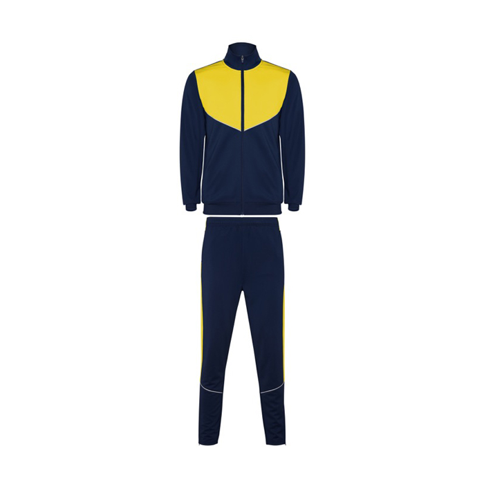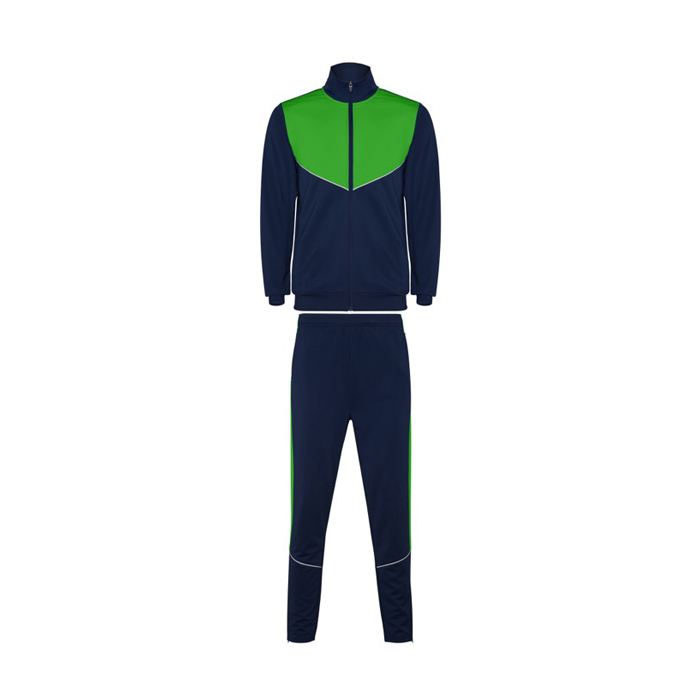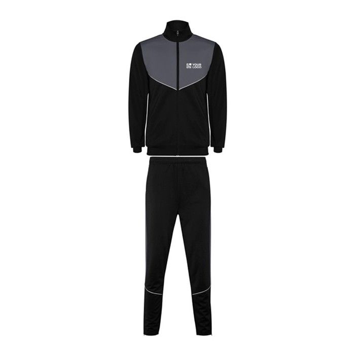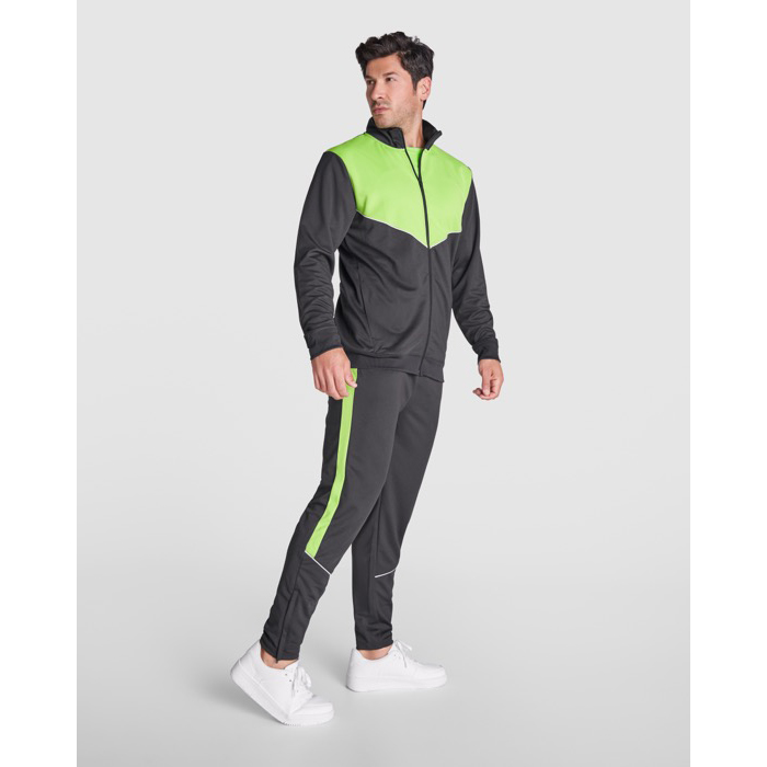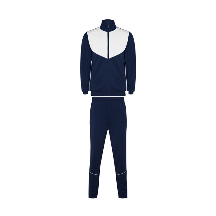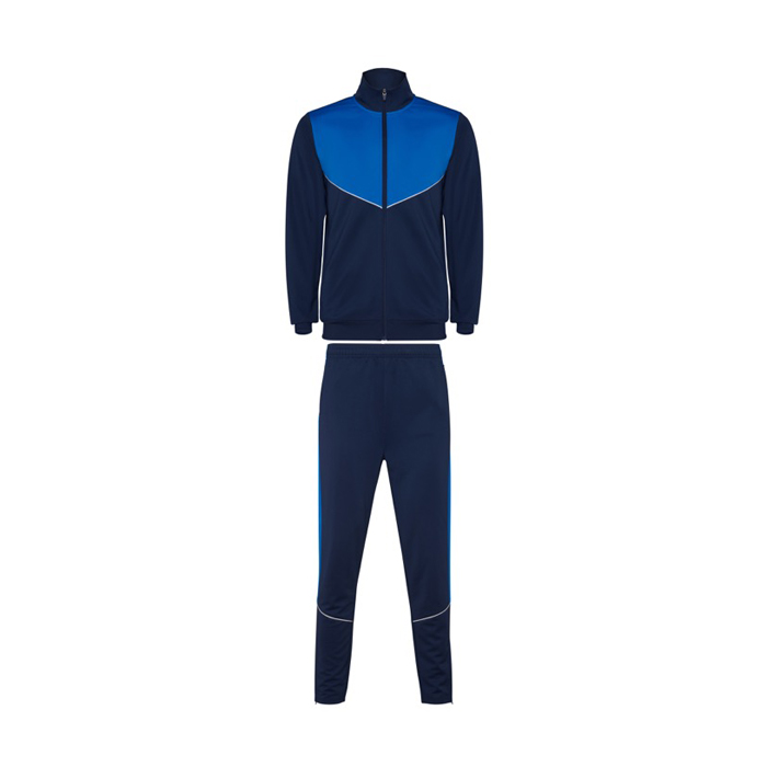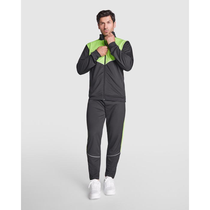 Chándal para hombre de la marca Roly, confeccionado en tejido ligero y elástico, ideal para jornadas activas. La chaqueta destaca por su diseño con el pecho a contraste de color y un vivo que añade un toque moderno. Incluye un cuello alto con cubrecosturas a contraste, cremallera central, bolsillos laterales, y puños y cintura en canalé 2x2 para un ajuste cómodo. El pantalón complementa el conjunto con una cintura elástica y cordón de ajuste, además de una pieza lateral a contraste con vivo y bajo con cremallera. Con un gramaje de 225.0, este chándal es perfecto para actividades corporativas o como uniforme promocional en eventos empresariales.