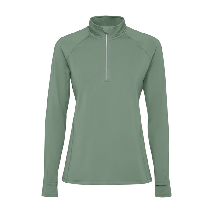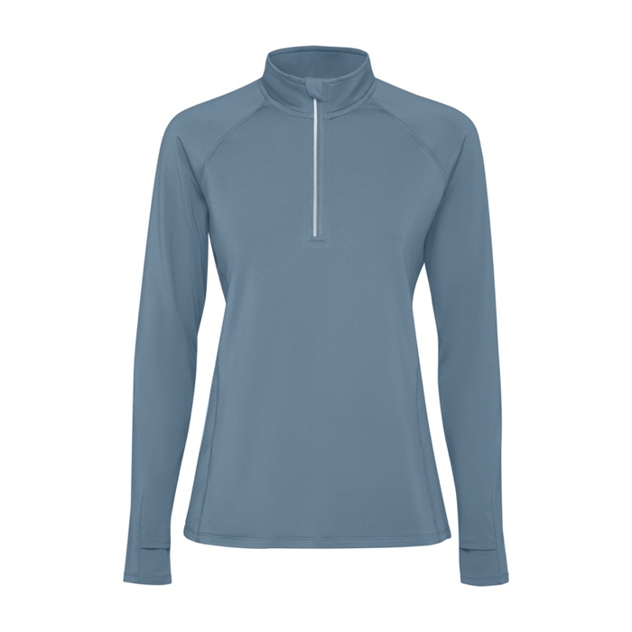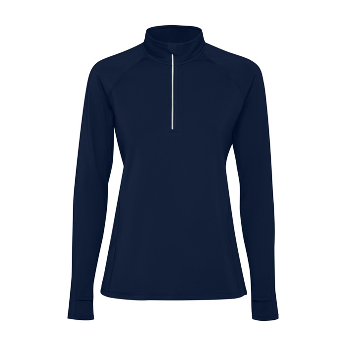 Sudadera técnica para mujer fabricada en poliéster reciclado, diseñada para ofrecer comodidad y funcionalidad. Presenta un corte entallado que se adapta al cuerpo, ideal para actividades que requieren libertad de movimiento. El cuello de media cremallera invertida permite ajustar la ventilación según las necesidades. Las mangas largas ranglán incluyen puños con apertura para el pulgar, proporcionando un ajuste seguro y mayor cobertura. Detalles reflectantes en la espalda y una banda reflectante mejoran la visibilidad en condiciones de poca luz. El tejido interior cálido perchado asegura confort térmico, mientras que el bajo de la espalda es ligeramente más largo para mayor protección. Perfecta para incluir en el merchandising corporativo, destacando el compromiso con la sostenibilidad.