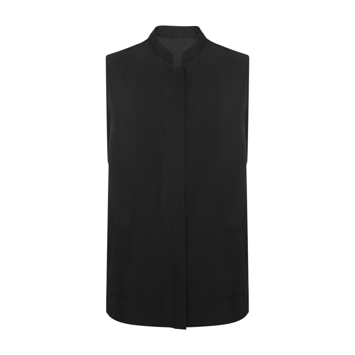 - Bata de mujer sin mangas con cuello mao y botones automáticos ocultos