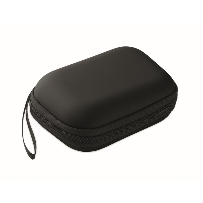 Botiquín de primeros auxilios en estuche rígido de PU, pensado para mantener el contenido protegido y ordenado. Incluye 2 guantes, 1 manta, 1 esparadrapo, 2 vendas, 1 tijera, 4 bastoncillos, 10 tiritas y 6 toallitas, cubriendo necesidades básicas ante pequeños incidentes. Formato compacto y fácil de guardar en un cajón, vehículo o zona común. Venta no disponible fuera de la UE. Adecuado para kits corporativos, recepciones o acciones de prevención en empresa.