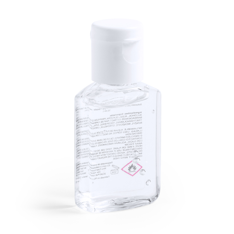 Gel para higiene y limpieza de la piel, presentado en un bote transparente de 15 ml, equipado con un práctico dosificador y un tapón de seguridad. Contiene un 65% de alcohol, garantizando una limpieza eficaz. Este artículo cumple con las Normas de Correcta Fabricación (GMP), asegurando su calidad y seguridad. No se aceptan devoluciones por motivos de higiene, tanto en productos personalizados como sin personalizar. Ideal para empresas que buscan ofrecer a sus clientes un regalo promocional útil y portátil, perfecto para mantener la higiene en cualquier lugar.