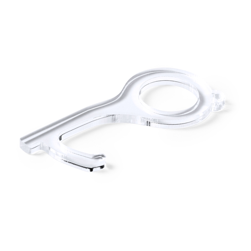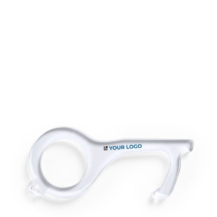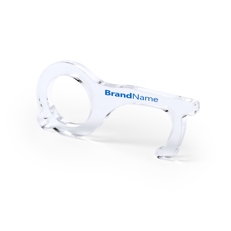 Llavero higiénico anti-contacto, fabricado en resistente material acrílico transparente. Diseñado para minimizar el contacto directo con superficies de uso común, este llavero cuenta con un cómodo troquel para el dedo, facilitando su uso en puertas, botones de ascensores y cajeros automáticos. Su presentación en bolsa individual permite una distribución sencilla y profesional, ideal para personalizar con el logotipo de su empresa. Perfecto para incluir en un pack de protección, este accesorio no solo es práctico, sino que también ofrece una oportunidad de marketing discreta y efectiva al resaltar su marca en un entorno de cuidado y seguridad.