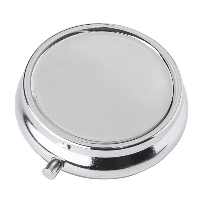 - Pastillero redondo de metal con organizador interno y espejo