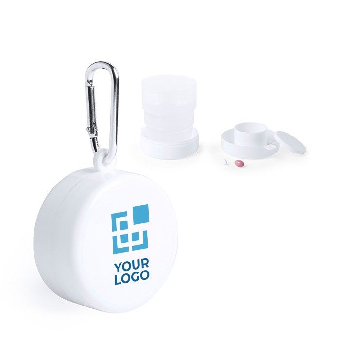 Vaso plegable de emergencia fabricado en un elegante color blanco, con una capacidad de 220 ml. Este práctico vaso incluye un pastillero integrado en el tapón, lo que facilita el almacenamiento y transporte de medicamentos o suplementos. Equipado con un mosquetón metálico, es fácil de llevar en cualquier bolso o mochila, ideal para profesionales en movimiento. El vaso se suministra en una bolsa individual, aunque el embalaje puede variar si se solicita con impresión personalizada. Perfecto para empresas que buscan soluciones prácticas para sus empleados en viajes o eventos corporativos.