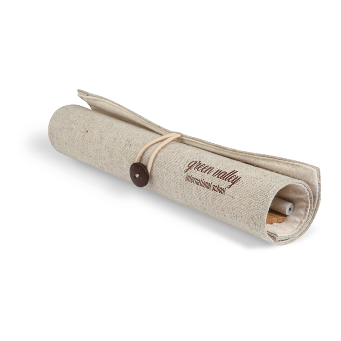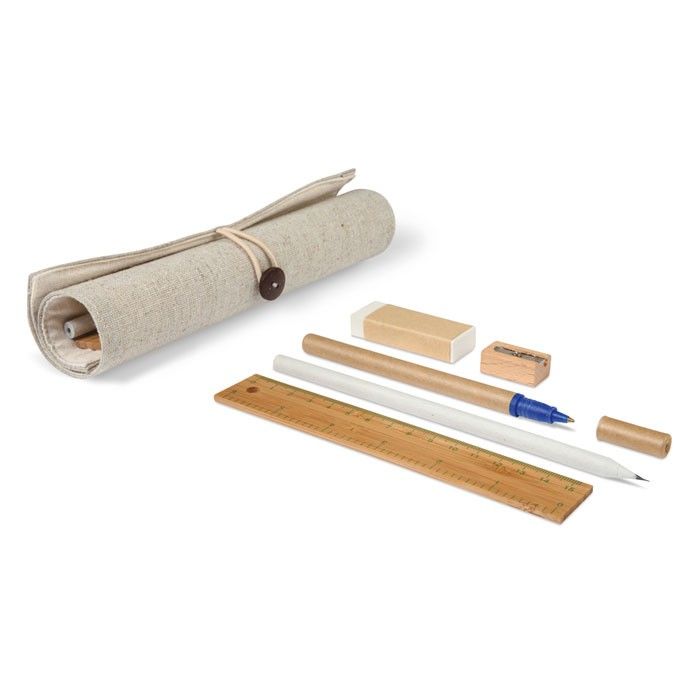 Estuche fabricado en yute y algodón, que combina durabilidad y estilo natural. Incluye una regla de bambú, un material natural que aporta un toque ecológico. El lápiz está hecho de papel, mientras que el bolígrafo, con tinta azul, tiene un cuerpo de cartón, lo que lo hace ligero y fácil de manejar. El sacapuntas es de madera, y la goma de borrar completa este conjunto práctico. El color del bambú puede variar, añadiendo un elemento único a cada pieza. Ideal para personalizar y ofrecer como regalo corporativo, este estuche es perfecto para eventos o campañas de marketing. Además, cuenta con servicio Express para entregas rápidas.
