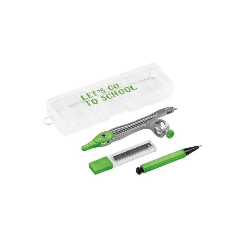 - Caja en PP con 3 piezas: compás, portaminas y 10 minas 0.5