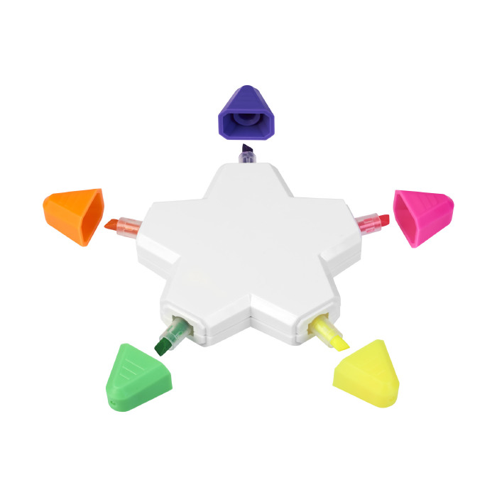 Marcador fluorescente fabricado en polipropileno, diseñado con una innovadora forma de estrella. Este práctico conjunto incluye cinco subrayadores en colores vivos, ideal para destacar información importante en documentos. Cada marcador está cuidadosamente reunido en una estructura compacta, facilitando su almacenamiento y transporte. Suministrado en una bolsa individual, garantiza protección y fácil distribución. Además, cuenta con un servicio Express para entregas rápidas. Perfecto para oficinas que buscan herramientas eficientes para la organización de documentos o como un regalo corporativo práctico y funcional.