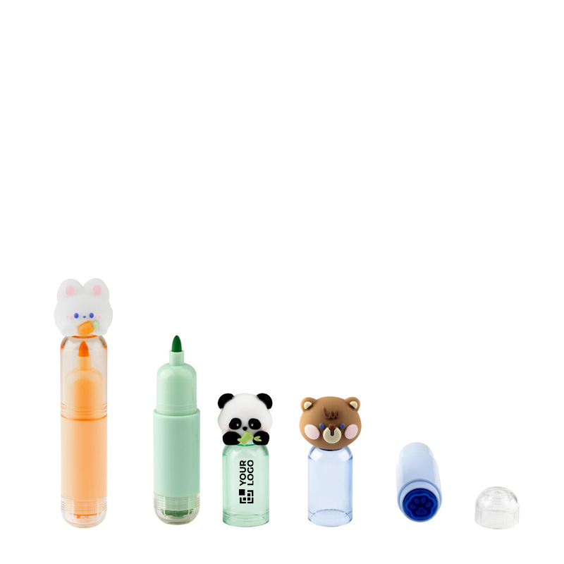 Set de rotuladores 2 en 1 fabricados con materiales seguros y diseñados para ofrecer una experiencia de coloreado más divertida. Cada rotulador incluye un sello en la base y una tapa con figura, lo que permite a los niños explorar su creatividad de múltiples maneras. El rotulador Conejo viene con un sello de zanahoria y tinta naranja, el marcapáginas Panda incluye un sello de flor con tinta verde, y el marcador Oso tiene un sello de pata con tinta azul. Presentados en una caja de regalo de papel kraft, estos rotuladores son ideales para eventos corporativos, promociones o actividades dirigidas a un público infantil. El servicio Express asegura una entrega rápida y eficiente.