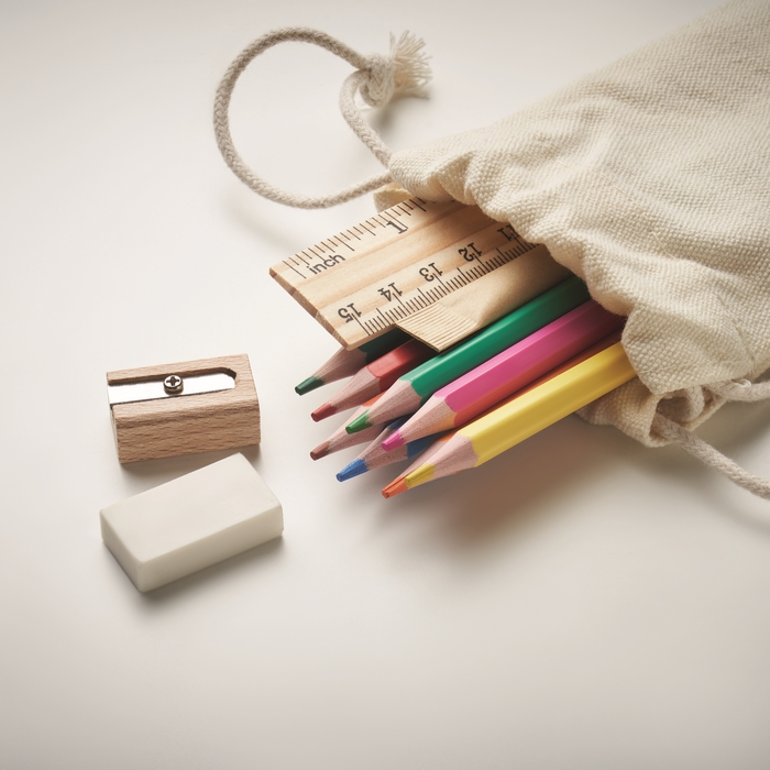 Juego de dibujo infantil fabricado con materiales sostenibles, ideal para fomentar la creatividad en los más pequeños. Incluye un juego de papelería de 5 piezas: una regla de madera, un sacapuntas de madera, una goma de borrar, un lápiz de madera y un bolígrafo de cartón. Además, cuenta con 10 lápices de colores adicionales y un bloc de papel reciclado A4 con 50 hojas lisas, ofreciendo 100 páginas para dibujar. Todo se presenta en una práctica bolsa de cuerdas de algodón, fácil de transportar. Perfecto para actividades corporativas o como regalo promocional en eventos educativos.