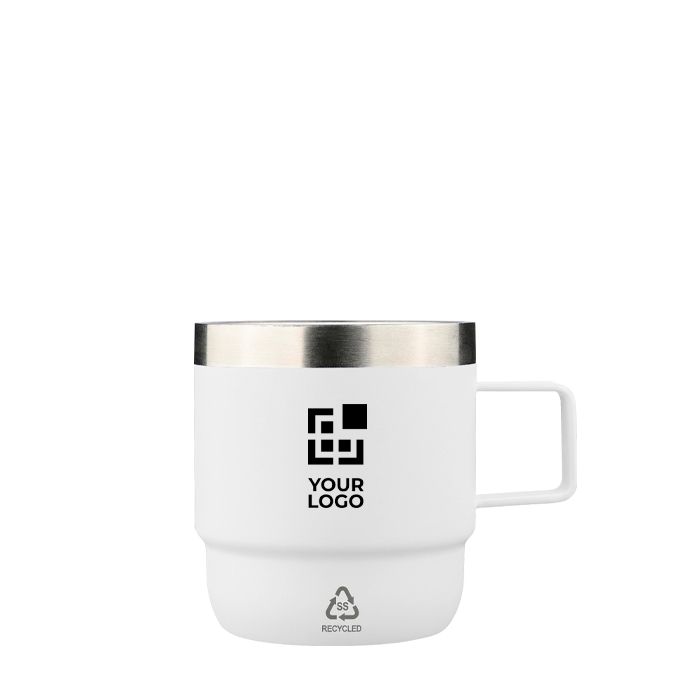 Taza de acero inoxidable con doble pared, pensado para entornos corporativos donde se busca un artículo compacto y consistente. El interior combina acero inoxidable 304 con recubrimiento cerámico para mejorar la higiene y reducir la transferencia de sabores y olores. El exterior es de acero inoxidable 201 e incorpora asa para un agarre cómodo. Incluye logotipo de acero inoxidable grabado a láser en la parte frontal y se entrega en caja individual de cartón marrón, útil para acciones de bienvenida o eventos internos.