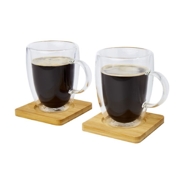 Set de 2 tazas térmicas de vidrio borosilicato con doble pared, diseñadas para mantener la temperatura de las bebidas durante más tiempo. Cada taza tiene una capacidad de 350 ml, ideal para disfrutar de café, té o cualquier bebida caliente o fría. Incluye posavasos de bambú de 10x10x1 cm, fabricados con materiales sostenibles y responsables, que añaden un toque natural y elegante a cualquier entorno. El set se presenta en una caja de regalo, lo que facilita su distribución y presentación. Con servicio Express disponible, es una opción práctica para empresas que buscan regalos corporativos o artículos promocionales de calidad.