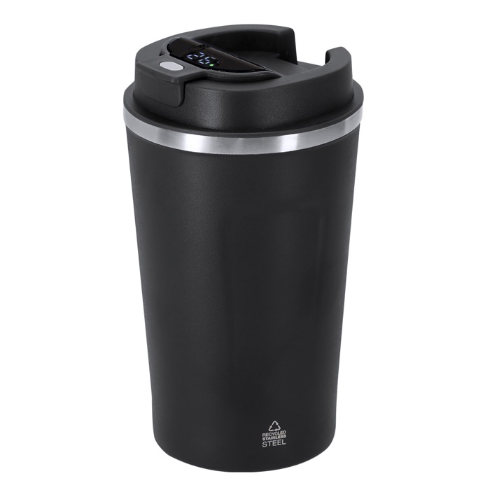 Vaso térmico de 400 ml fabricado en acero inoxidable reciclado. Este innovador vaso cuenta con una pantalla táctil en la tapa que permite ver la temperatura interior con un simple toque, facilitando el control del contenido. Su tapadera de seguridad garantiza un cierre hermético, evitando derrames. Libre de BPA, es seguro para el uso diario. Aunque no es apto para lavavajillas, su diseño sostenible destaca por el uso de acero reciclado. Mantiene el calor durante 3 horas y el frío hasta 6 horas, ideal para mantener bebidas a la temperatura deseada. Perfecto para empresas que buscan productos sostenibles y funcionales para sus empleados o como parte de estrategias de marketing ecológico.