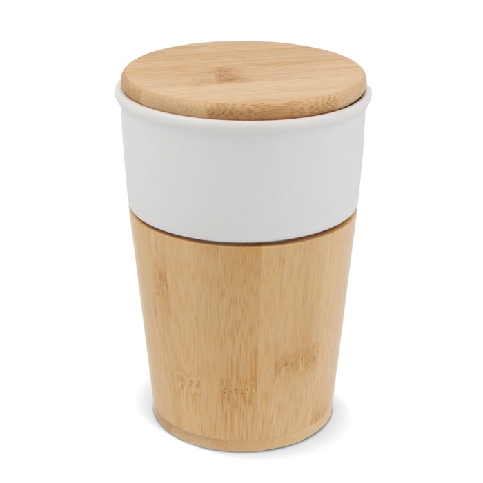 Vaso de cerámica con detalles de bambú y tapa a presión