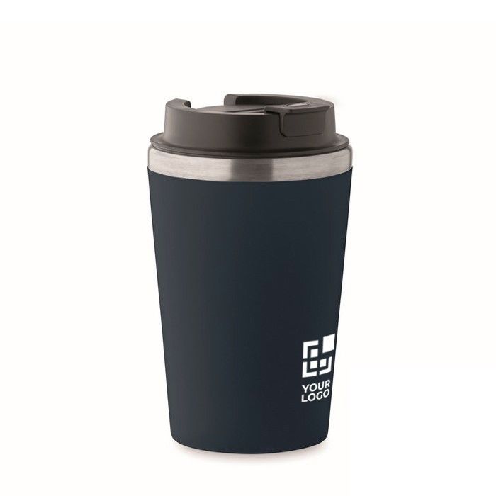 Vaso de doble pared fabricado con una pared exterior de PP (polipropileno) y una pared interior de acero inoxidable reciclado, compuesto por un 90% de acero reciclado y un 10% de acero nuevo. El revestimiento interior de cerámica asegura que las bebidas mantengan su sabor original. Su diseño antifugas garantiza que no haya derrames, lo que lo hace ideal para el uso diario en oficinas. Con una capacidad de 350 ml, es perfecto para disfrutar de café o té. Además, el servicio Express permite una entrega rápida, ideal para empresas que buscan un detalle corporativo práctico y elegante.