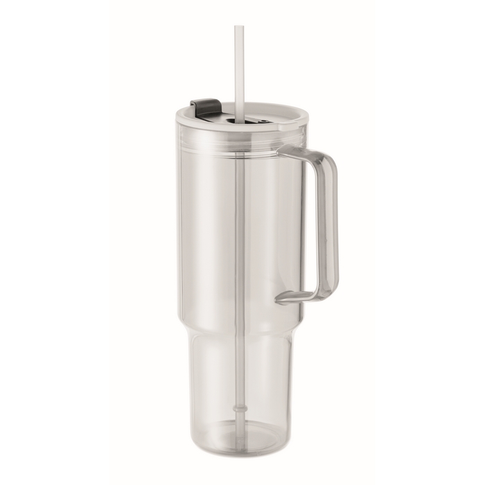 Vaso de RPET con tapa para pajita y pajita incluida de PP, pensado para un uso diario en oficina, eventos y espacios de atención al público. La capacidad de 1200 ml ayuda a reducir recargas y es práctica en jornadas largas. La tapa encaja para un transporte más cómodo y para minimizar salpicaduras. Superficie adecuada para personalización con el logotipo. Recomendado para packs de bienvenida, acciones internas o regalos en ferias.