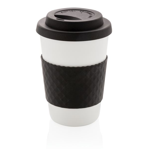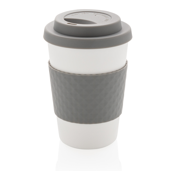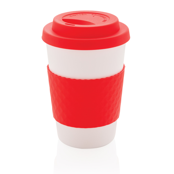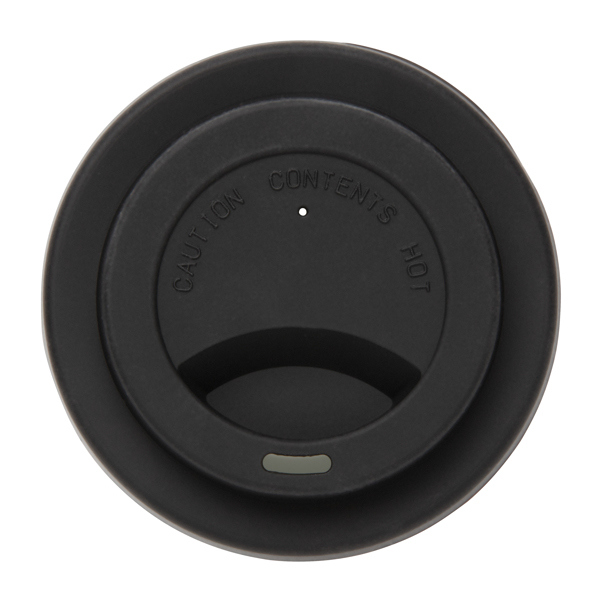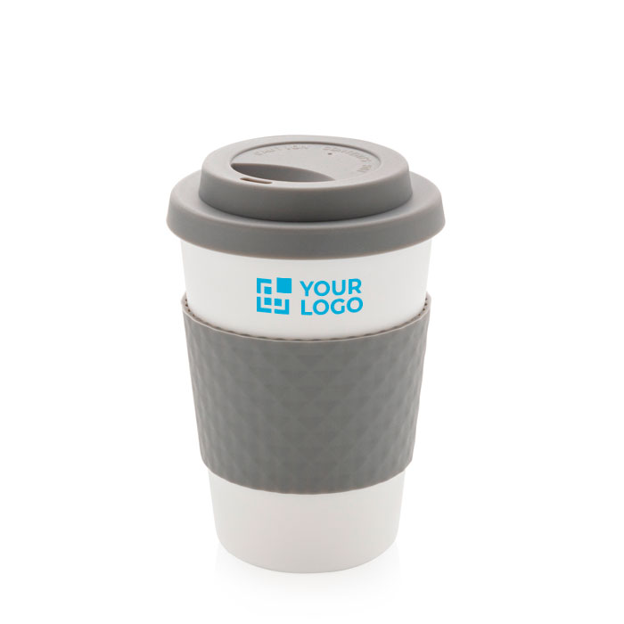 Taza de viaje de plástico PP 100% reciclable. Con tapa y cinta de silicona (elegibles en varios colores) para poder beber mientras te desplazas. Es segura para bebidas de 100 grados celsius (aprobado), destacando así su versatilidad. Además, es apta tanto para lavavajillas como para microondas y se adapta a la mayoría de las cafeteras. Sin duda uno de los vasos take away más completos de la colección, de calidad, con función antigoteo, y que aguanta el calor hasta 2 horas y el frío hasta 4.