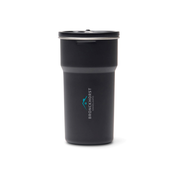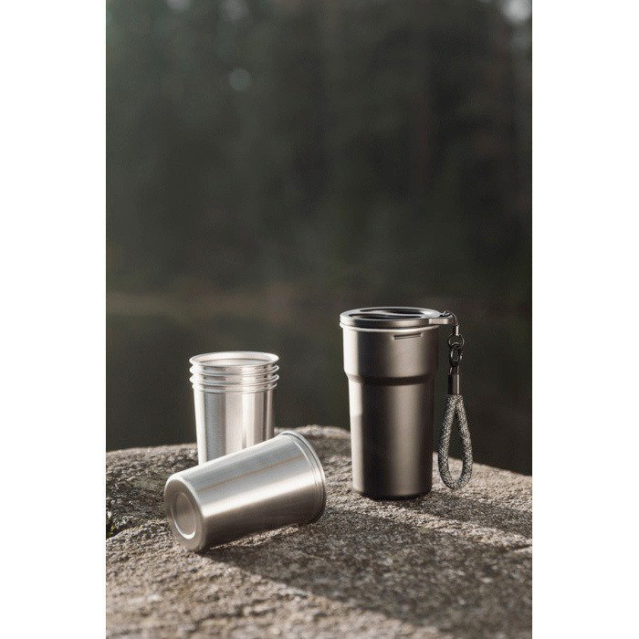 Vaso de viaje de 450ml con asa que tiene un juego de tazas apilables de acero inoxidable reciclado que facilita compartir bebidas en salidas y desplazamientos. Incluye cuatro tazas de 250ml que encajan dentro creando un formato compacto y fácil de llevar. La certificación RCS (Recycled Claim Standard) valida la trazabilidad del material reciclado en la cadena de suministro; el producto incorpora un 79% de acero inoxidable reciclado certificado. No apto para lavavajillas ni microondas. solo lavado a mano. Útil para eventos outdoor. viajes de empresa o acciones de marca en equipo.
